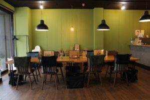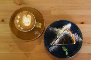 自然を感じられるような落ち着いた雰囲気の店内で、くつろぎながら淹れたてのコーヒーと自家製ケーキ、こだわりのカレーやパスタも楽しめます。店名の由来はペットのウサギの名前とのこと。かわいらしいうさぎの雑貨が店内にディスプレイされています。