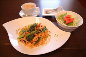 シンプルな店内でお客様との距離が近く、家の延長線上でくつろげるような空間を意識しています。一番人気のセットメニューお求めやすい価格でパスタorカレー、サラダ、飲み物がいており、提供料理全体がリーズナブルで満足度の高いラインナップになっています。