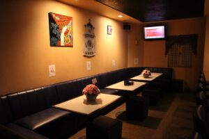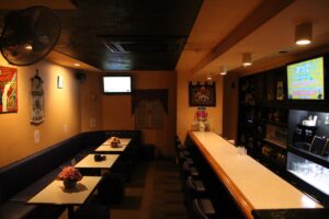 黒ベースの家具で統一されたシンプルな店内。タイ出身の店主さんが週末や連休の際にお通しや、おつまみとしてオリジナルのタイ料理をふるまってくれるスナックです。